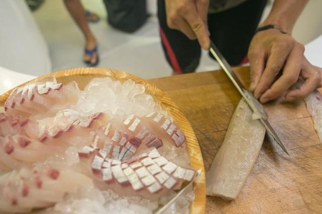 當天色漸漸暗去,「名隆號」點起燦爛燈火,圓弧型戶外BBQ吧台烤肉滋滋,香氣四溢,現場現切最新鮮生魚片盛裝上桌,廚師超厲害,三兩下就做出一大盤生魚片啦!超澎湃的漁家料理,讓大夥兒盡情享用美食之後,就是最精采刺激的海釣時間了!