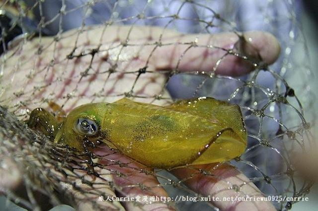 最後被撈上岸的軟絲,是託指導員的福,當時看到一隻軟絲緩緩游近,就拿起大網一把撈起,噴墨家族包括:小管、透抽、花枝、軟絲、章魚,其中軟絲絕對是極品,市價也最高,今晚中頭彩啦!