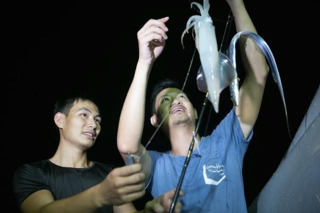 釣魚過程中,偶爾有隻迷路的小螃蟹飄過來,還有呆呆不飛的飛魚,活跳跳的小軟絲,一生氣將整桶水噴黑,太小的漁獲可是要直接放生,讓牠長大,勿趕盡殺絕。