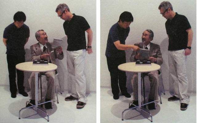 日本設計師深澤直人(左1)與英國設計師 Jasper Morrison(右1)不僅相當敬重柳宗理,也是其設計的愛好者,例如兩人的家裡都特別選用柳宗理的不銹鋼鍋具及餐具組,也深深為產品的「手作」線條著迷。圖為兩位設計師於 2006 年在日本「Super Normal」展覽中與柳宗理的合影,翻攝自 Super Normal 展覽出版品。(Photo credit:Lars Müller Publishers)