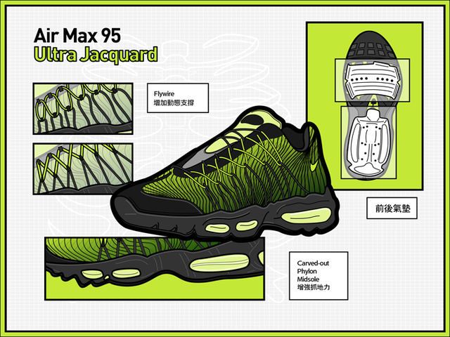 Jacquard究竟是什麼?跟同為編織技術的Flyknit技術有什麼不同?簡單來說如果Flyknit是針織,Jacquard就是平織,融入如同神經網絡的flywire後,鞋身強度與輕量獲得顯著提昇;外觀上依然保持Air Max 95 OG的前後氣墊配置,更加愛護你的膝關節。大底部份也做了些微的調整,Carved-out Phylon Midsole部份挖空的設計,除了減輕重量外,也因為增加了摩擦面積,帶來更佳的抓地力。