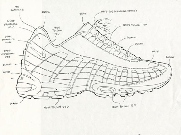 在1994年之前,Sergio Lozano並沒有跑步產品的設計經驗。在此之前,他的主要設計重心還在網球、訓練和ACG(全天候裝備)裝備上。不過這種突然的轉變並不令他驚訝。那時候Nike的設計團隊規模來得小很多,參與各種品類產品的設計也還是一種標準化的操作流程。才剛剛進入Nike工作四年,年輕的Sergio Lozano就被指定領導Nike最新的Air Max專案,但事實上,他對Air Max的構思早已開始。那是遠在他被招入Air Max項目之前的一個雨天,Sergio Lozano的靈感在欣賞Beaverton的風景時迸發了。“我望向湖泊對岸的樹林,開始想像雨水融化泥土的過程。我在心中想,如果那個完美的產品能隨著泥土的沖蝕而被發掘出來,這不是很有趣嗎?” Sergio Lozano回憶道。他迅速地畫了一個關於這款鞋的草圖,鞋上的條紋與科羅拉多大峽谷上看到的十分相似,隨後他把這幅草圖塞進了他的創意匣子裡。