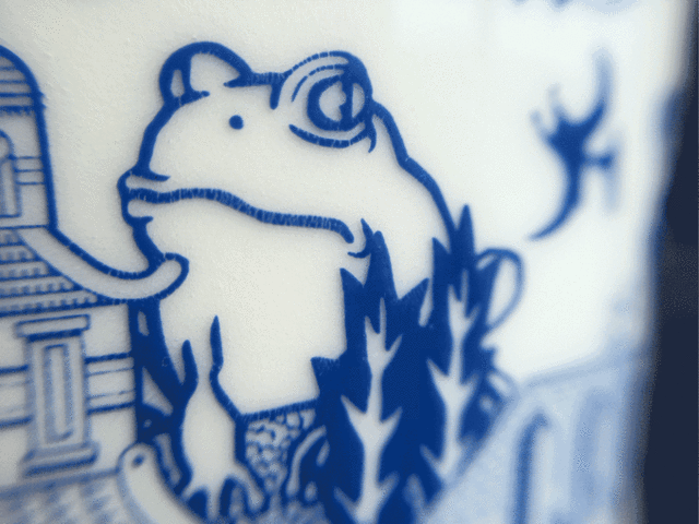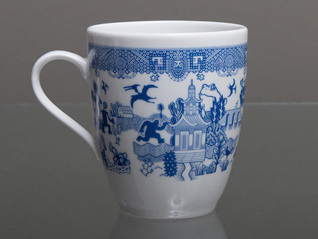 原來馬克杯上頭貌似傳統青花瓷的圖騰不是大家印象中的菊花、唐草等各式植物,而是恐龍、怪獸、機器人、外星人、大蛤蟆、大海怪這些不太可能出現在現實生活中的幻想角色,他們恣意的遊走閒晃,完全是群魔亂舞的感覺!但原本應該是既混亂又令人驚慌的場面,怎麼越看越有療癒感,越看越覺得心情舒坦。