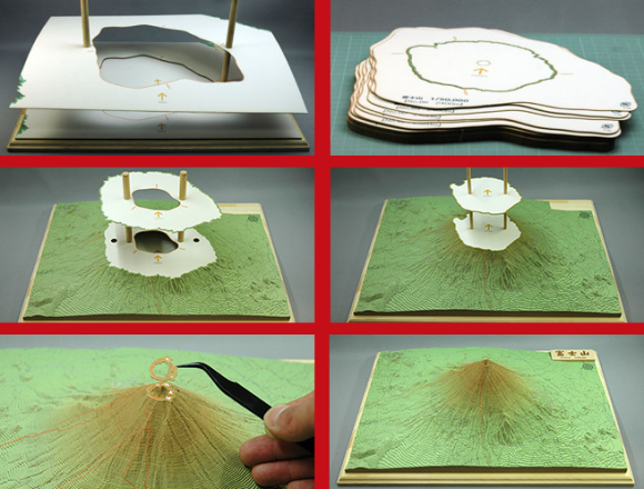 由北海道模型公司 QRC 所推出的富士山紙模型 Yamatsumi,以 1:25000~1:150000 的比例尺所製成,與一般模型不同的是,Yamatsumi 是依照一層一層的等高線堆疊上去,最後疊出一座長約 40 公分、高約 3.6 公分的 3D 立體富士山。由於這些地質資訊全都採用來自日本國土地理院的數據,因此擬真度可說是非常高。而且為了提倡環保,QRC 還特別以牛奶盒等回收材質製作模型。