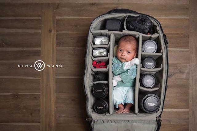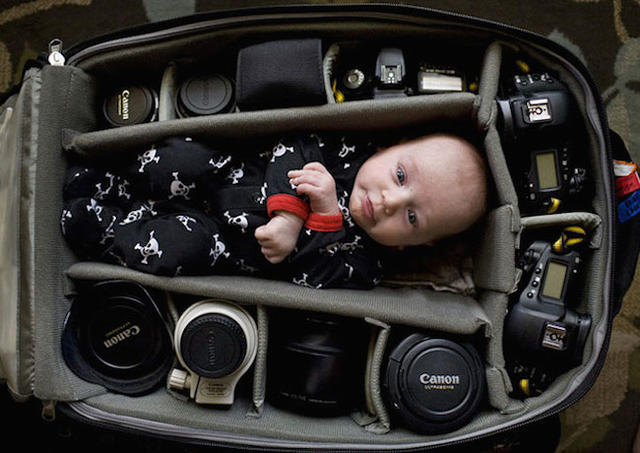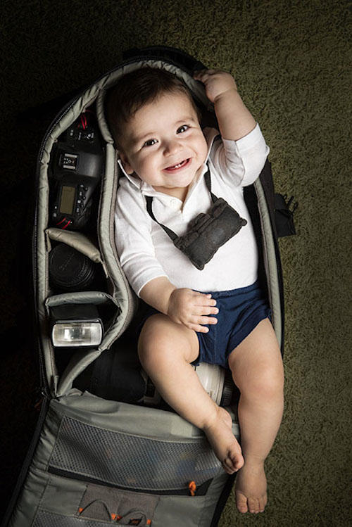 不管是稍大的小寶寶,還是剛出生沒多久的小小小寶寶,全被熱愛攝影的爸媽放進了平常擺滿珍貴寶貝的相機包裡。攝影師們用一張張簡單的照片告訴大家,這可愛的小嬰兒是才是我的第二生命,最好的保護當然要留給他/她。這另類的炫兒照不只捕捉了小嬰兒們甜美可愛的笑容,還成功與自己的興趣結合,或許還能順便展示自己的相機們(笑),難怪有這麼多攝影師喜歡上這個有趣的攝影主題。