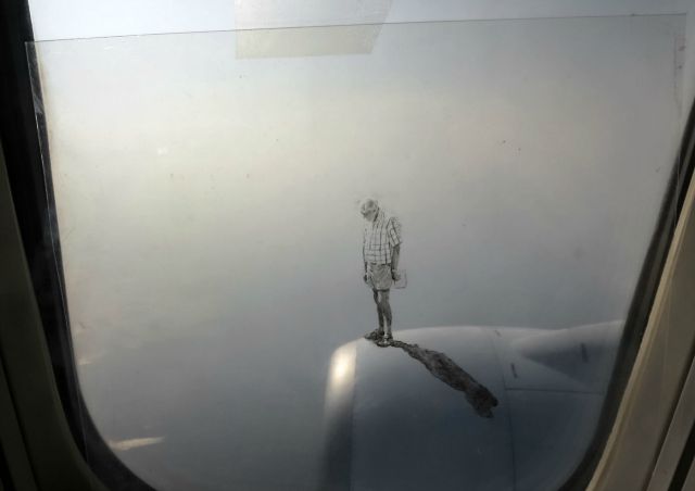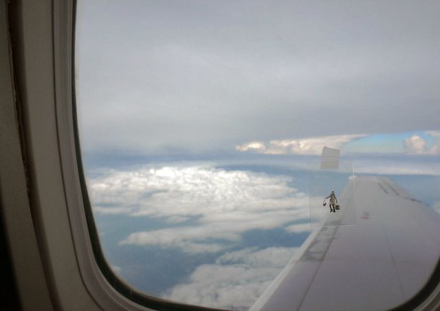 英國藝術家 Claire Harvey 在醋酸鹽膠片上,畫上獨自旅行的旅人,再用透明膠帶貼在飛機窗戶上,看上去,就好像真的有個人,孤伶伶的站在機翼上,或者遙望遠方,或者低頭冥想,或者有些搖搖晃晃,在茫茫的雲海中,努力尋找著出口。