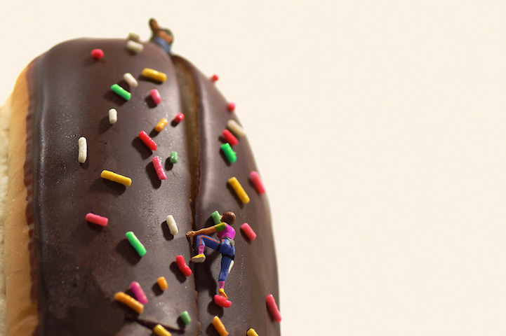 於是,我們看到照片中,在五線譜上奔跑的運動選手們,用力跨過一個個八分音符的欄杆,邁向終點;啦啦隊隊員舉著糖果般的彩球,活力四射;巧克力麵包上的彩色巧克力,成為攀岩時的重要岩點;穿著簑衣站在削鉛筆機上的農人,散發著風蕭蕭兮易水寒的壯士氣場。