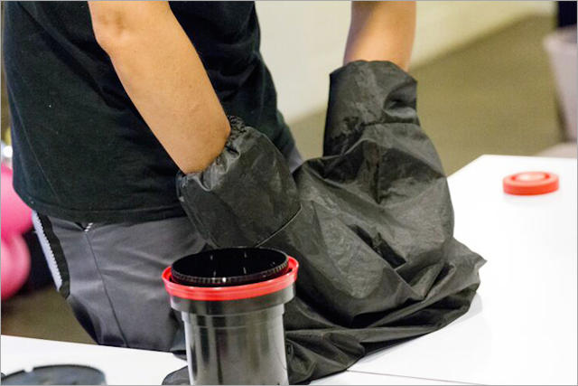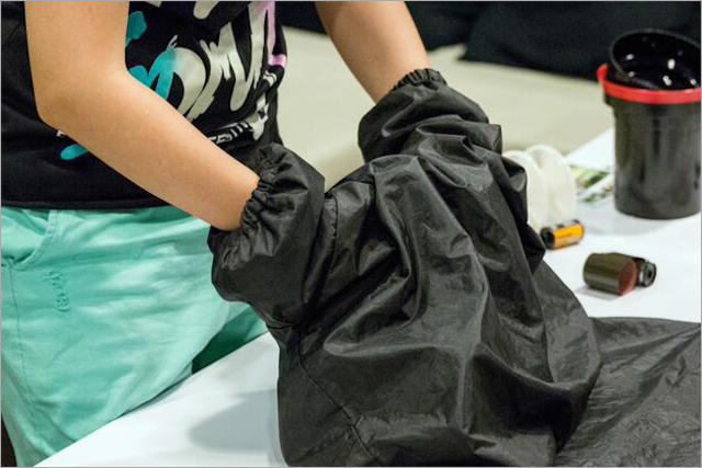 這是一件黑色不透光的大衣?它其實是仿效暗房的概念,使用不透光材質的布料裁製出一處小小的、可方便攜帶移動的行動工作暗房。在這樣一處小暗袋裡,我們體驗將底片從相機裡取出,再裝填進沖片罐裡,過程是需要慢慢的從剛剛的練習,現在開始一步一步地將它完成。