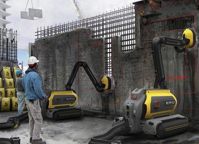來自瑞典設計學院的 Omer Haciomeroglu 設計了一款 ERO機器人,ERO 是 Erosion(侵蝕)的縮寫,透過高壓水槍侵蝕混泥土表面,使其產生裂縫隨之瓦解,如此一來混泥土中的砂石與鋼筋混泥土就能被分離。