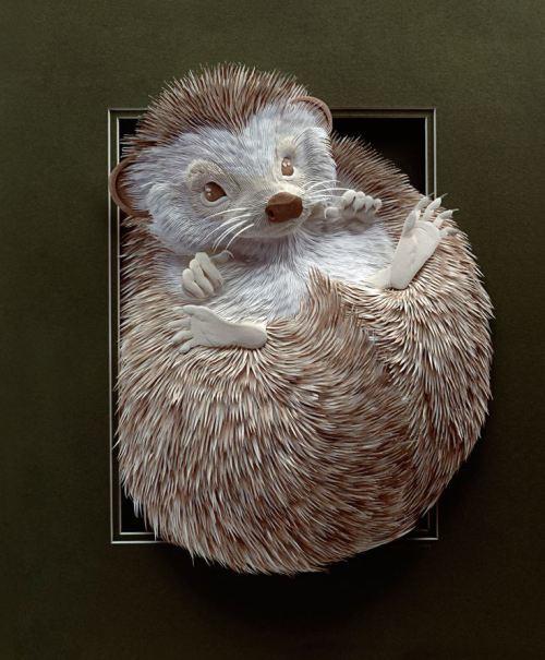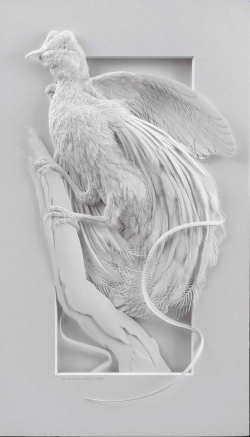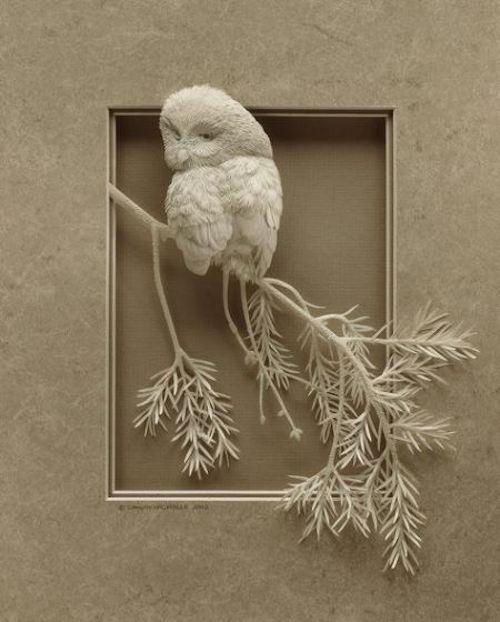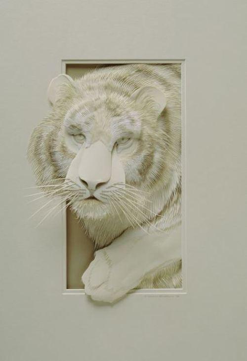 加拿大藝術家 Calvin Nicholls 不只利用「紙」作為他創意想像的發展之旅,更藉此展開一場穿梭於二維與三維的「紙世界」之中,用極致的手做技術仿效著自然動物們的面容,在細膩的雕刻與黏貼裡頭,把牠們的毛絨、羽翼等揣摩的栩栩如生~靈動的詮釋裡頭,有著耐人尋味的姿態,而在這一幅幅即便僅是純白的藝術之中,也有著超越於顏色之上的精彩!