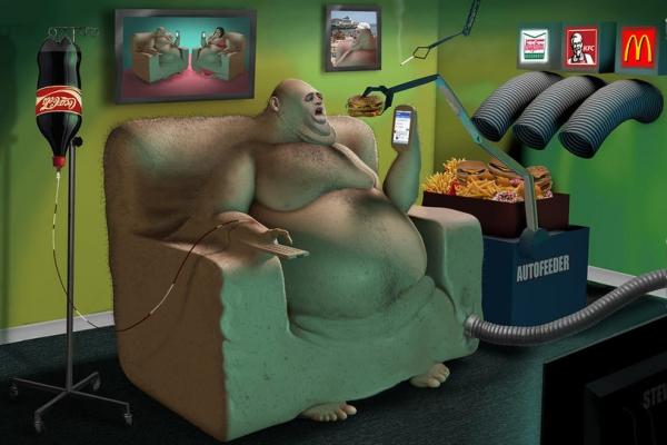 插畫家 Steve Cutts 以近乎噁心的誇張漫畫風格呈現他眼中的現代社會,作品中表現了科技過度發展的今日,在物質各方面過度消費卻精神貧乏的人類群像。