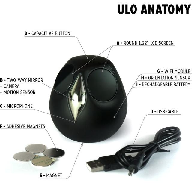 Ulo 擁有監視攝影機的基本規格,可透過 wifi 用手機遠端操控、用來對話的喇叭、即時拍照錄影(720p)、可擺頭、動態偵測感應,偏偏就是那圓滾滾的機身和重要的靈魂之窗---一對 1.22" LCD 螢幕,用來和鏡頭前的人玩互動遊戲,會眨眼、待機狀態時會瞇著眼裝睡、感應到人手指靠近時會鬥雞眼,就像真的貓頭鷹或者貓咪般有趣,讓人光是看影片就忍不住愛上 Ulo 俏皮。
