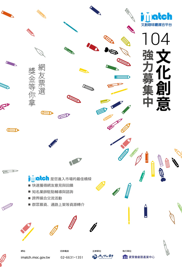 為了不負眾望,最直接相關的文化部從兩年前便著手成立 iMatch文創咖啡廳媒合平台,串聯各方資源,協助優秀團隊尋找資源,已積極媒合了三百件以上的合作機會,期盼為萌芽中的創意澆上甘霖般的滋養泉源。文化部104年文化創意提案旨在鼓勵創作與嘗試的團隊或個人,有機會可運用媒合資源與機會,讓剛起步的文創團隊更能發展更多的合作,來看看具體的獎勵!