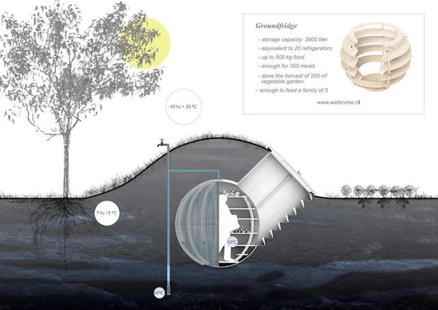Groundfridge是個以特殊絕緣材質打造、重達300公斤、直徑2.28m的圓球,專門設計放置於地底下、利用土壤天然的保溫效果,讓球體內的平均溫度能穩定維持在7℃-15℃間,藉此來保鮮食物。