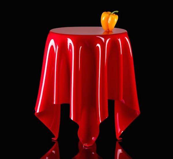 Bauer使用透明的壓克力為材質,創造出桌巾垂墜於地的視覺效果,透明的壓克力一眼就能望穿,如果真要藏什麼能動手腳的地方,都完全無所遁形,不過壓克力畢竟不是軟綿綿的布料,抓住整張桌子的平衡點後,再安上桌腳,不只增強了桌子的穩定度,更讓這套障眼法找不到破綻。