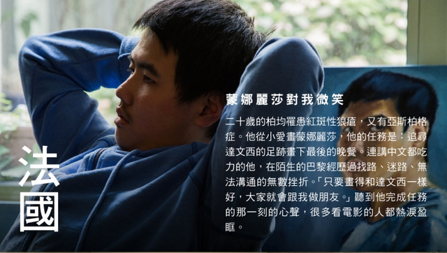 柏鈞,一位罹患紅斑性狼瘡與亞斯伯格症,不為同儕所接受的青年,連講中文都吃力的他卻執意要巴黎親眼看看他從小臨摹的蒙娜麗莎,一心想著「我若畫得像達文西一樣好,大家就願意和我做朋友了。」