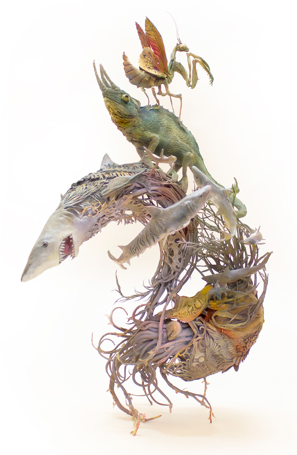 其雕塑靈感多是「走」出來的,舉凡森林、海洋、城市,或是鄉村果園,通通都是她的創意寶庫。 Ellen Jewett 陶瓷雕塑是從最內層開始,勾勒出動物的形貌,去除動物本身的重量,使得作品的質感更貼近雕塑,之後再層層疊疊的添上週遭的外圍環境,營造出美麗、奇幻、乖誕的氛圍,也賦予了這些動物生命與死亡、野生與馴養等不同的元素。這些「添加物」全都是黏土、顏料、拋光漆、釉料等無毒的材料,而且盡可能取用在地材料或是天然材料,使得 Jewett作品更貼近自然。