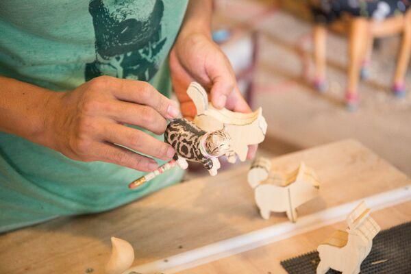 想作室的名字由來就是 “一點想法工作室" 的轉化,一聽就知道老師滿幽默的人。雖然看來想大哥(擅自幫老師取的小名~XD)是一名很粗曠的男人,但是看過他的作品,便會發現他的刀工和色彩的設計還有動物造型、工作室環境的佈置,真的是相當的夭壽可愛,完全會讓人融化。總覺得想大哥如果身在古代,應該是會被大小姐愛上的伐木工人,有著溫柔如水的心跟粗曠帥氣的外表!