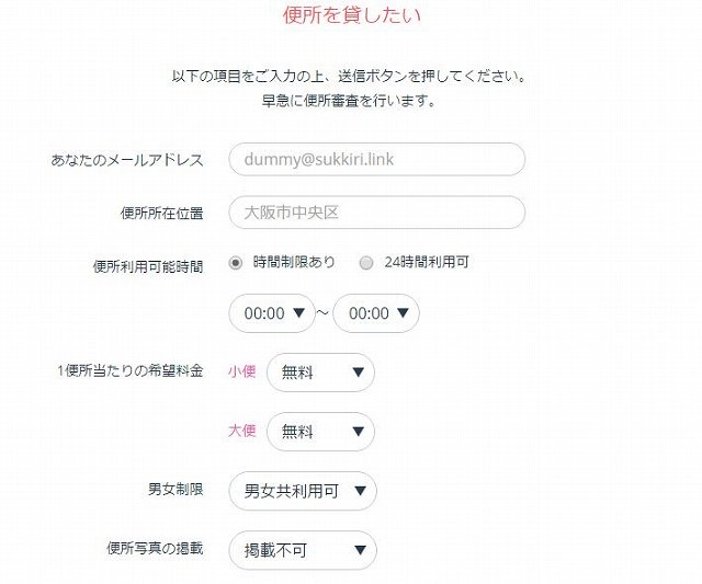 當然,該網站也大力募集「我家的廁所借你用沒關係!」像這樣願意出借自家廁所的民眾。因為出借廁所的主人還能拿到報酬。登錄時會詢問希望出借他人使用廁所大小便之際可以領收的費用(免費~500日圓),請從中選擇一個項目。之後如果真的把廁所借給他人使用的話,可以經由 SUKKIRI 向來者領收如小費般的報酬。