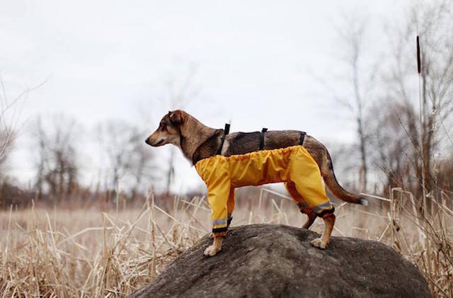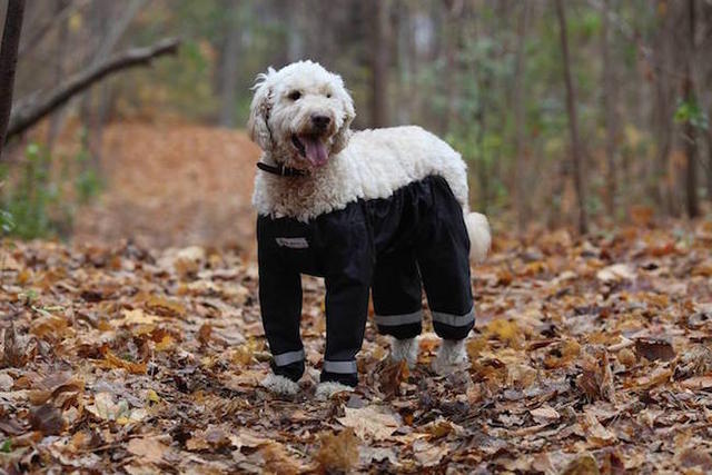 相對於其他部位的茂密毛髮,狗狗腹部的毛量通常是少上許多,若到水邊或雪地上遊玩,沒有即時擦乾,體溫很容易就慢慢流失,受寒感冒都是很有可能的。因此Muddy Mutts設計出防水的狗狗專用戶外褲,讓寵物在戶外遊玩時可以穿上它來達到保暖的功效。