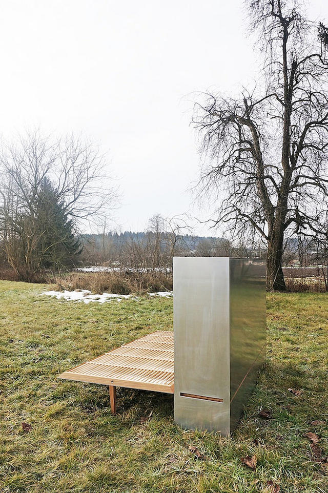 大鋁箱名為「Travelbox」,簡潔的薄型鋁製外殼,誰想的到其中另有玄機呢?不明白的人或者不打開看的話,可能會以為是某種大型機台吧。而將鋁箱的一面拆下,立刻出現的是由橡木製作的單人床板。