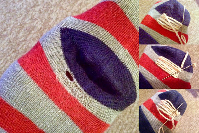 為了鼓勵大家跟他一起這麼做,@basilsauce也不吝嗇的和大家分享補破襪的訣竅。如果是正方形的補丁,記得補丁的範圍要比破洞大。穿針後,從襪子破洞的內側下針,並留下大概兩公分的線頭,然後沿著破洞從左到右,橫向下針。完成後,再改為由上到下,與橫向縫線垂直、上下交錯的方式下針,記得在橫向的線最好要鬆一點,這樣垂直的縫線才比較好縫。最後一針記得把針頭穿回襪子的內側,與原本留的線頭打結後,剪掉多餘的線頭,就大功告成啦!