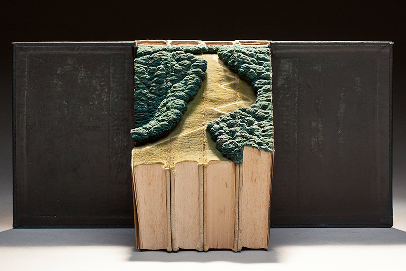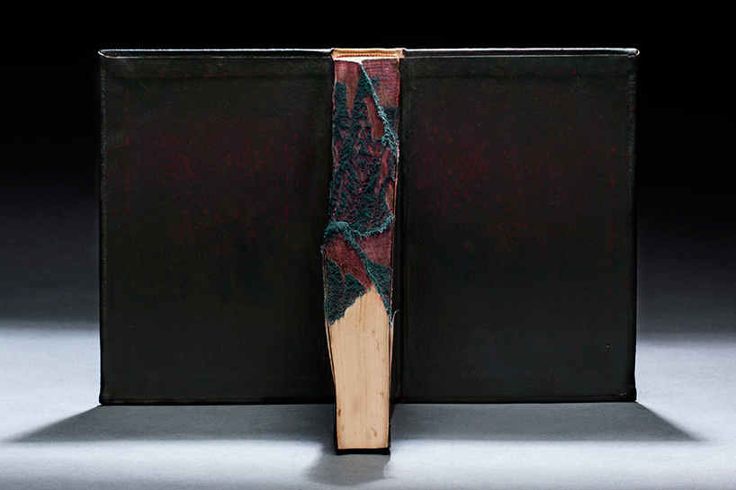 Laramée 的每件書雕作品都由兩個部分組成,封面和封底的部分是手繪鳥類,內頁才是書雕。Laramée 在 Santa Catarina 州首都 Florianopolis 的二手書店,找到許多五零年代巴西出版的經典文學作品,立刻就被這些美麗的亞麻封面所吸引。