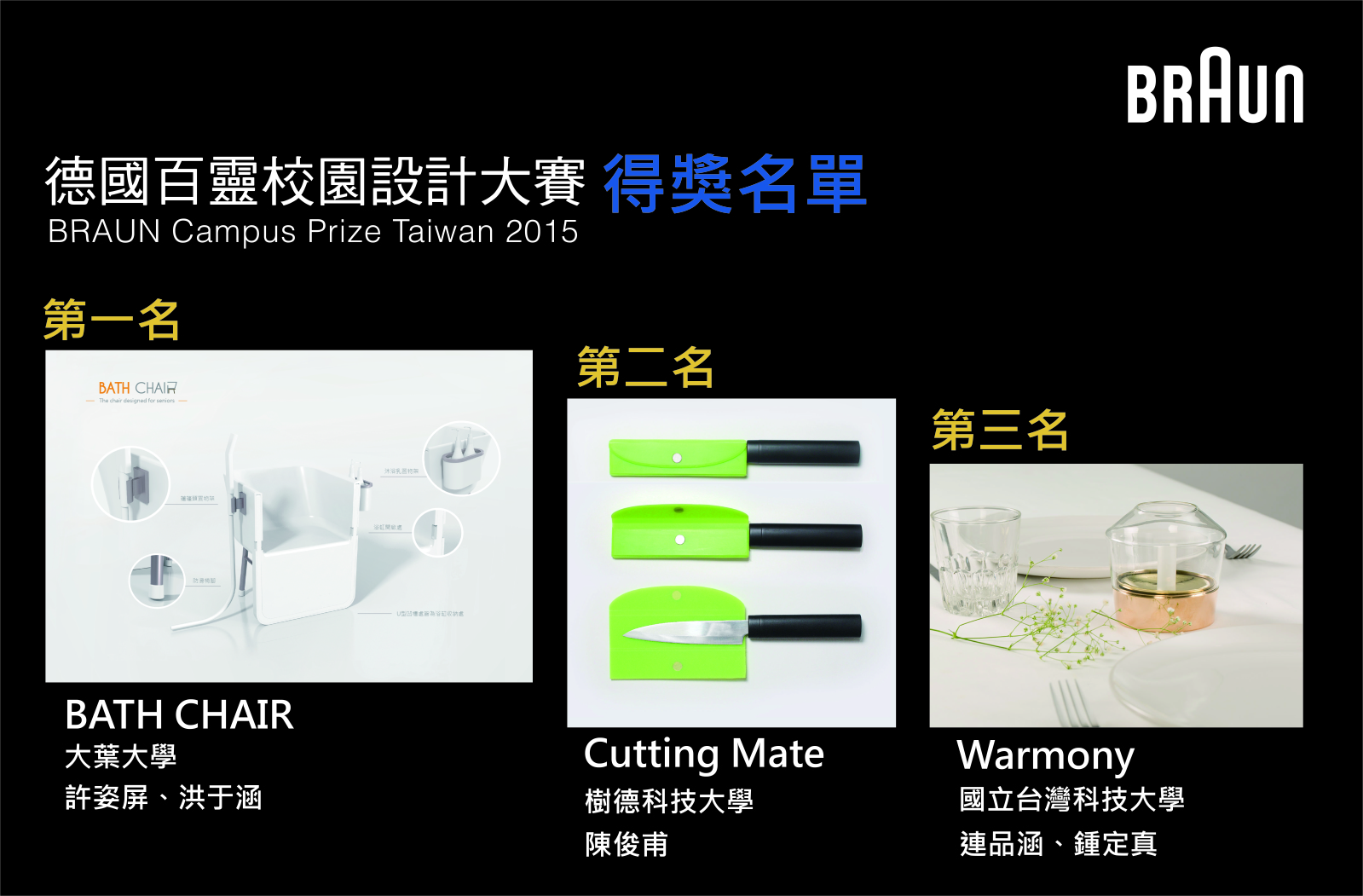 2014德國百靈校園設計大賽第一名優勝者,目前就讀台北科技大學工業設計研究生歐陽宏柏表示,透過參加比賽可以提升自我的邏輯思考能力,同時也可瞭解各設計領域的評審對作品的想法及建議,可以從比賽中獲益良多。此外,配合競賽活動的辦理,主辦單位將於台北科技大學、雲林科技大學及高雄第一科技大學辦理校園講座;主要邀請國內知名設計師進入校園,與莘莘學子分享設計產業趨勢發展及相關實務經驗。
