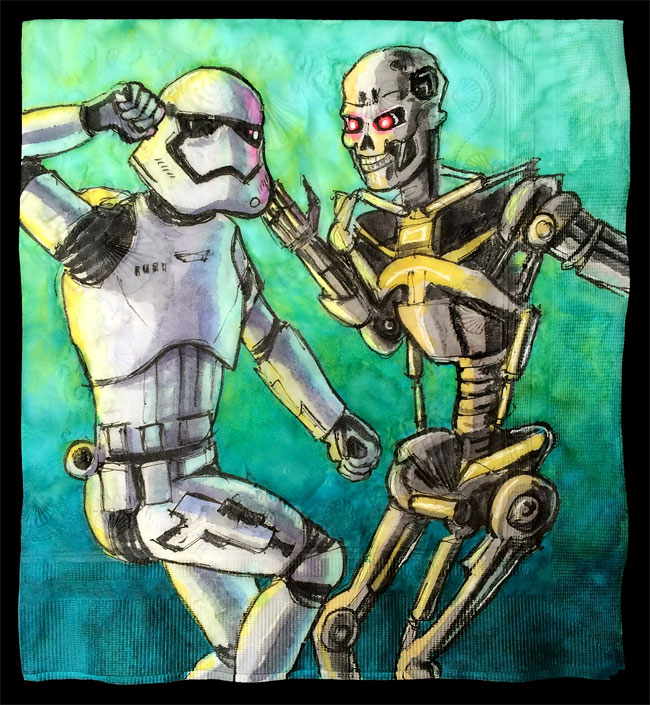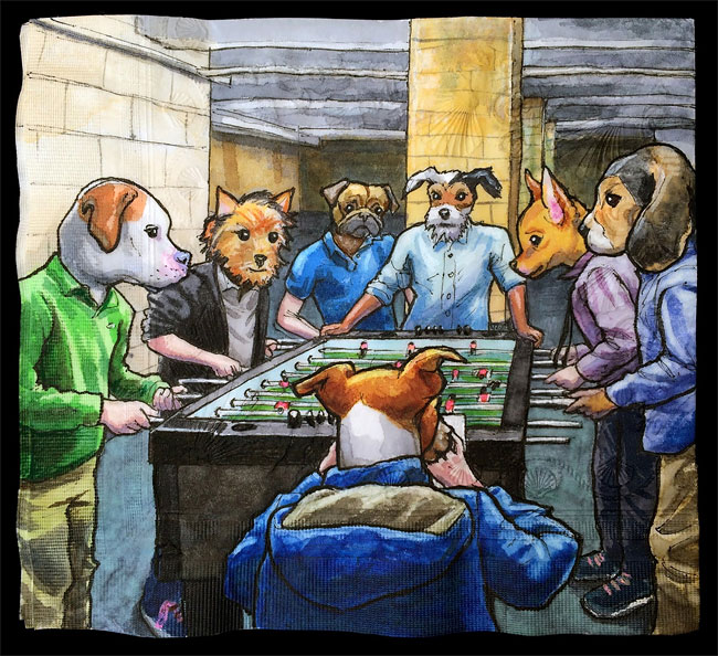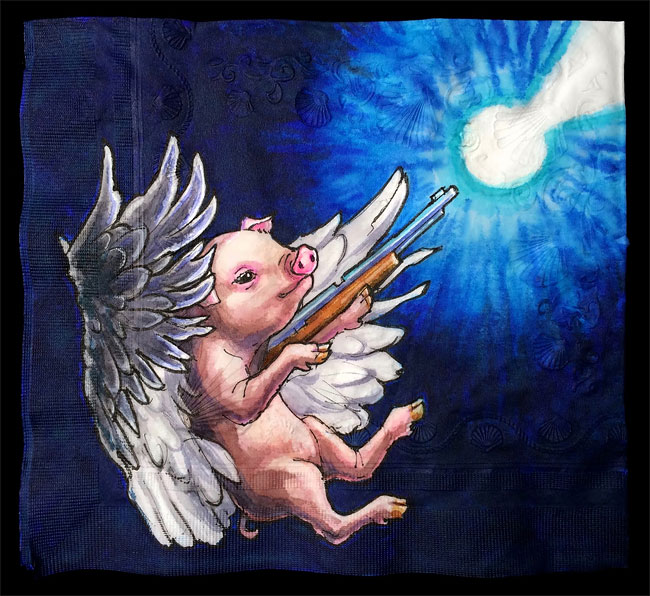 Nina Levy 的紙上作業,主角通常為有趣漫畫或是熱門人物,而且帶有一種詼諧幽默的色彩,白話一點,就是惡搞漫畫啦!「我們家中有成千上萬裝滿『有色』餐巾紙的盒子,孩子們喜歡一再翻閱先前的作品,結果就是餐巾紙滿天飛囉~」Nina Levy 無奈地說。