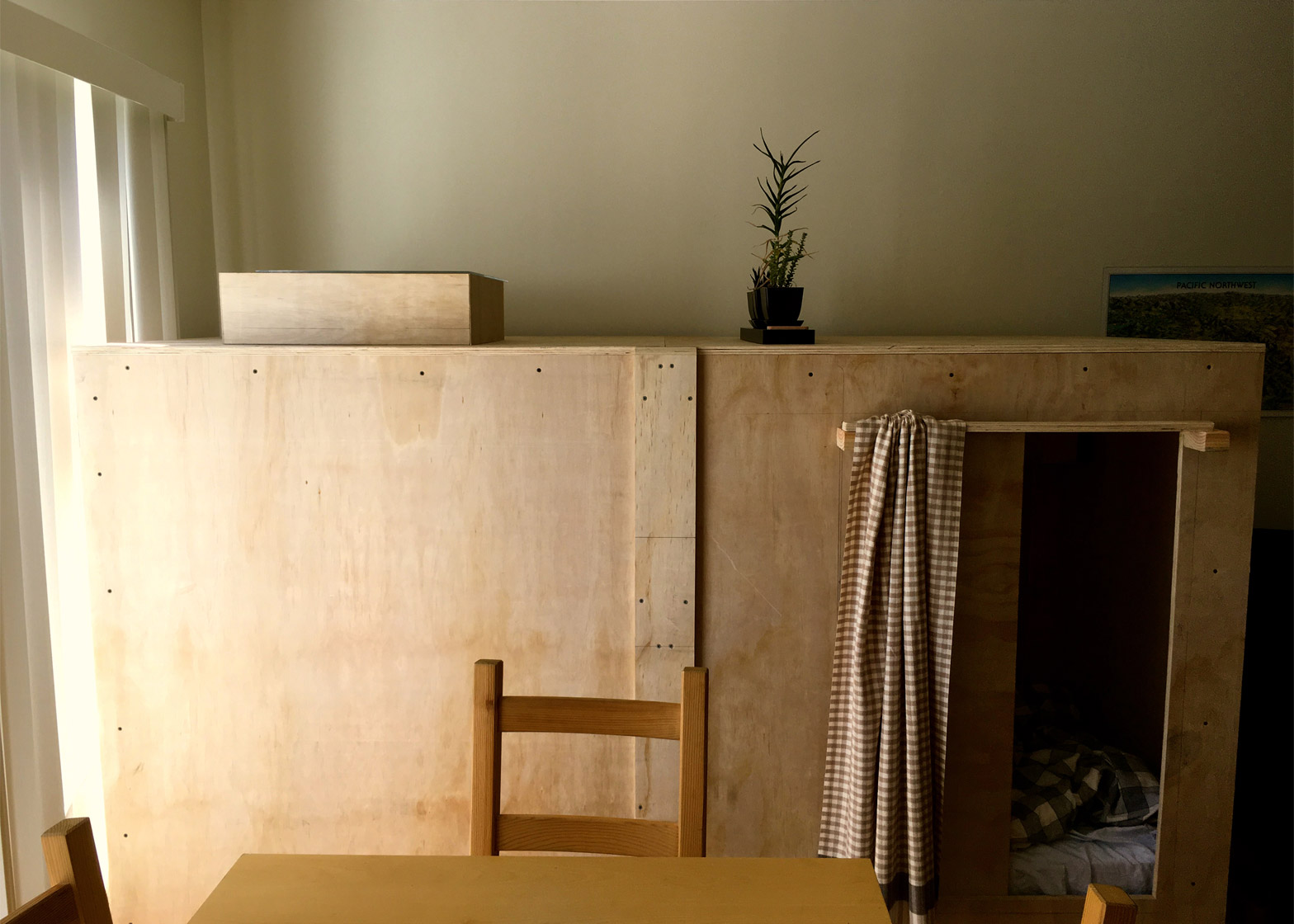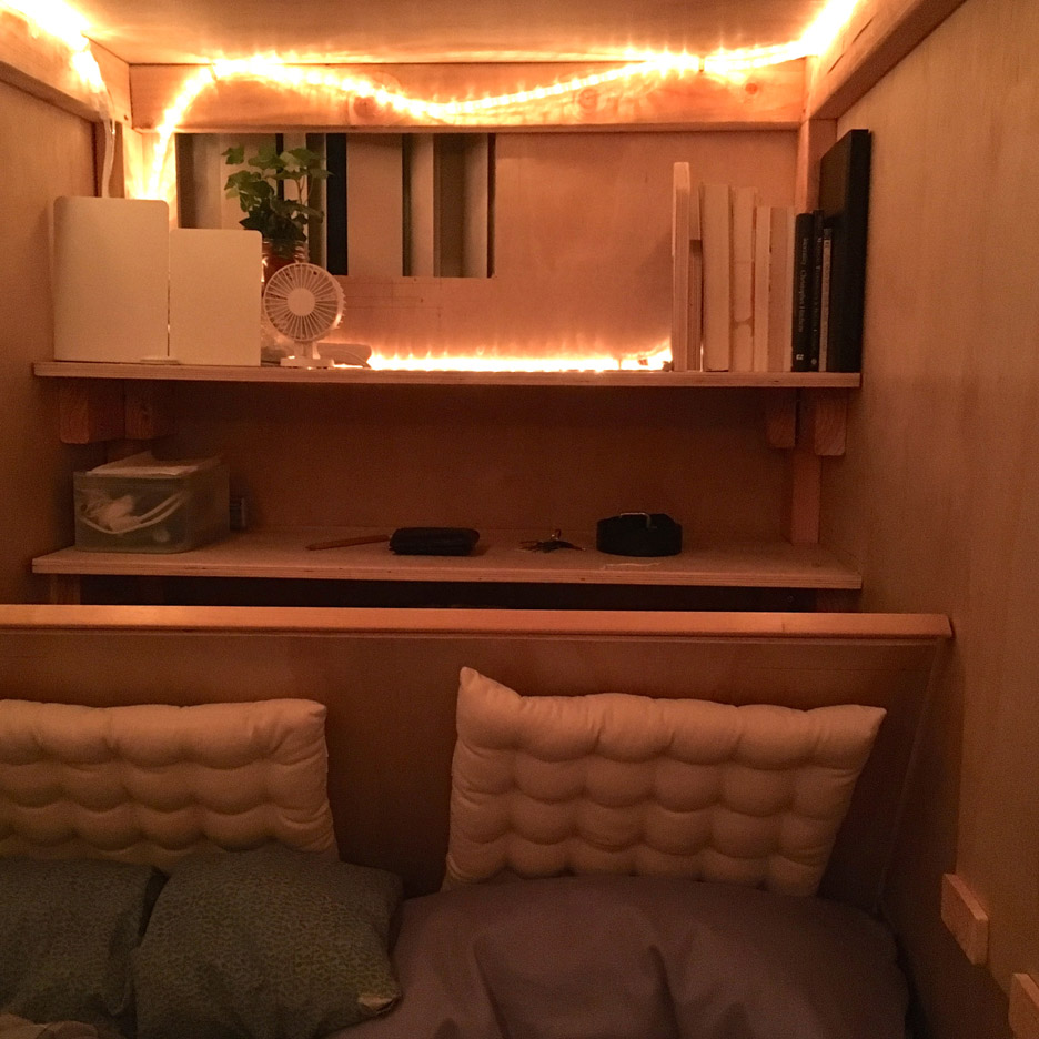 在這個小小空間中,四周是用膠合板搭起的隔間,床尾處則是拉門,如果想要講究一點,也可以裝上門簾稍微裝飾一下。