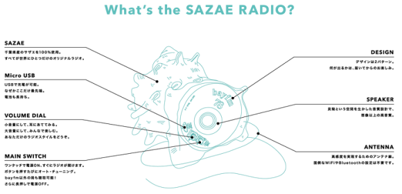 Sazae 的意思是角蠑螺,由於 bayfm78 位於千葉縣,因此 bayfm78 特別挑選當地生產的角蠑螺,經過人工組裝充電用的 USB、音量和電源開關、喇叭和天線等等零件,所以基本上,除了外觀是貨真價實的貝殼以外,Sazae 就和一般的收音機沒什麼兩樣,也因為這些都是真正的貝殼,不是什麼山寨仿品,因此只有限量100個,每個要價日幣 3,980 元(約台幣 1,150 元),但......可不是你有錢就買得到,或是有時間排隊就排得到喔!因為bayfm78 是用抽籤的方式決定貝殼落誰家!
