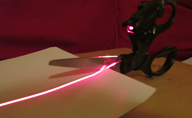 其實剪刀的構造很簡單,在剪刀的姆指柄上方,加裝了一個低功率指向型雷射。(有人會問為什麼不用 LED 就好,因為 LED 是擴散式的發光,而雷射是可以發射絕對直線的光束) 要不然星際大戰裡的絕地武士們拿 LED 光劍打來打去就好,雷射光劍多傷本啊。