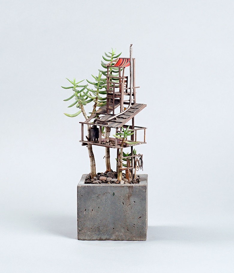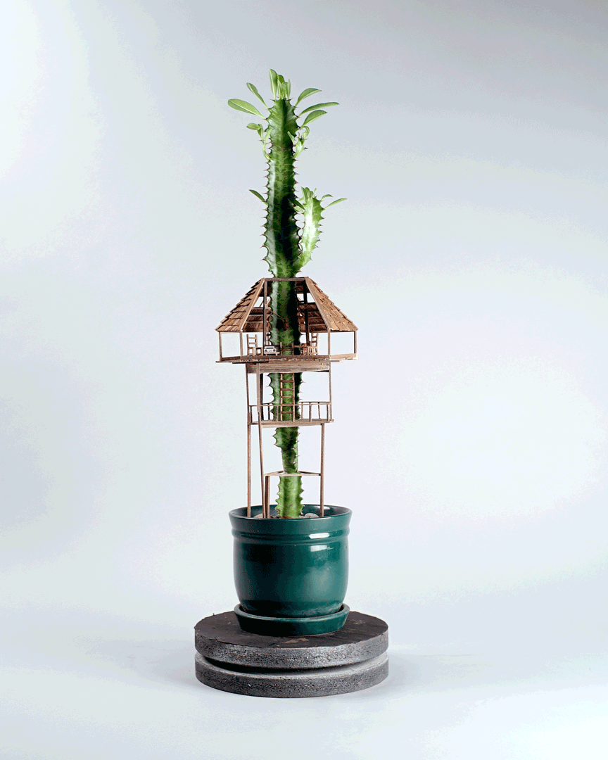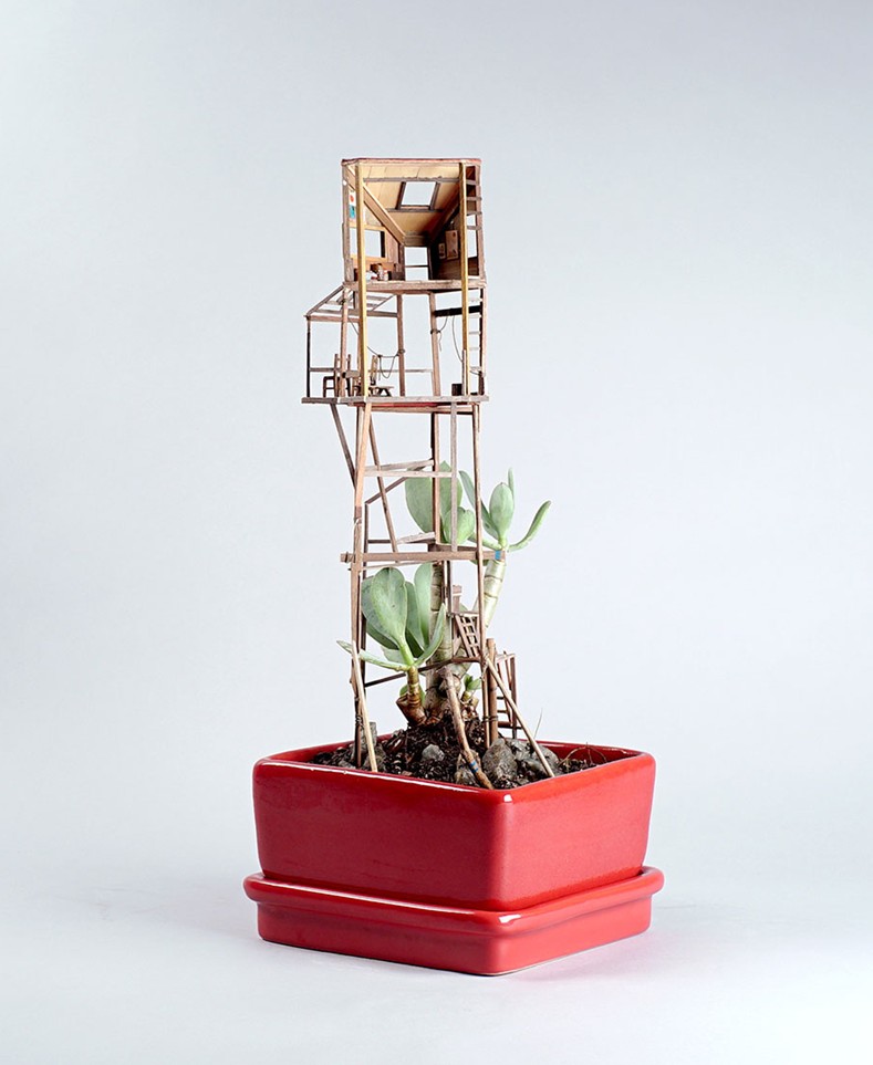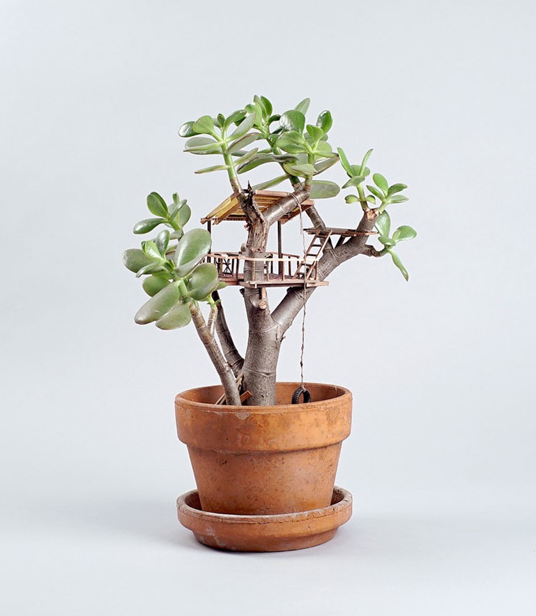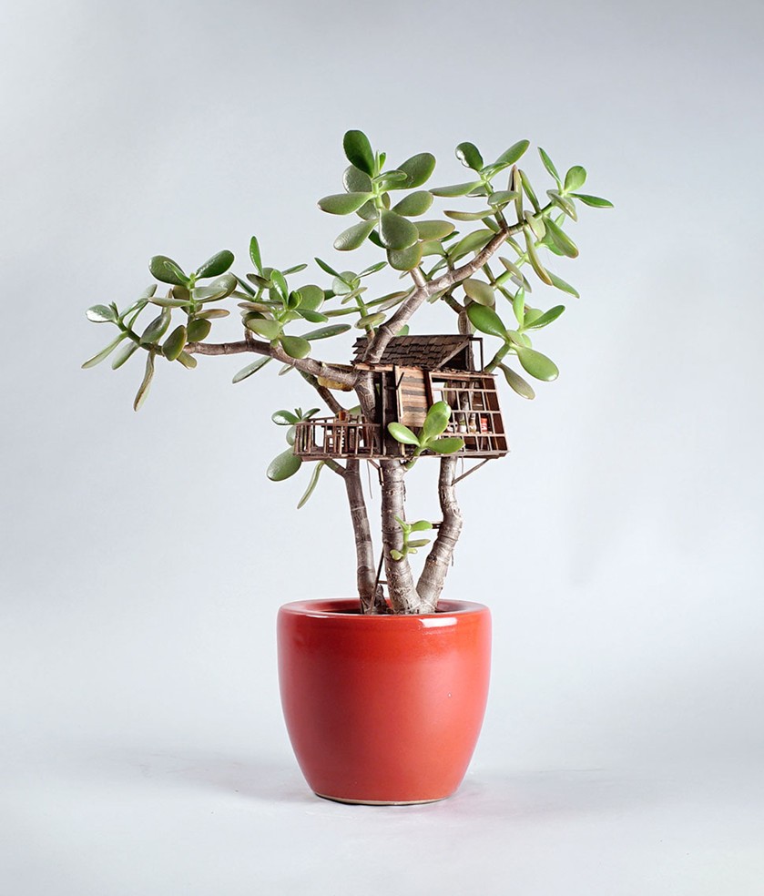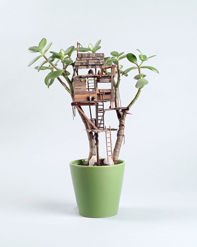 住在美國洛杉磯的藝術家 Jedediah Corwyn Voltz,突發奇想,決定把家中常見的室內盆栽,施以神奇的微型魔法,建造出一棟棟與眾不同的精緻小樹屋。Voltz 擁有十年以上的製作電影道具經驗,並成功地將巧藝運用到這些彷彿是螞蟻搭建出來的建築藝術,若是蟻人就可以省力許多。