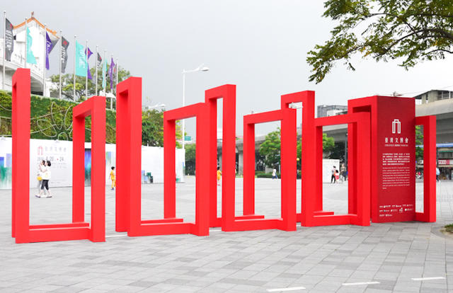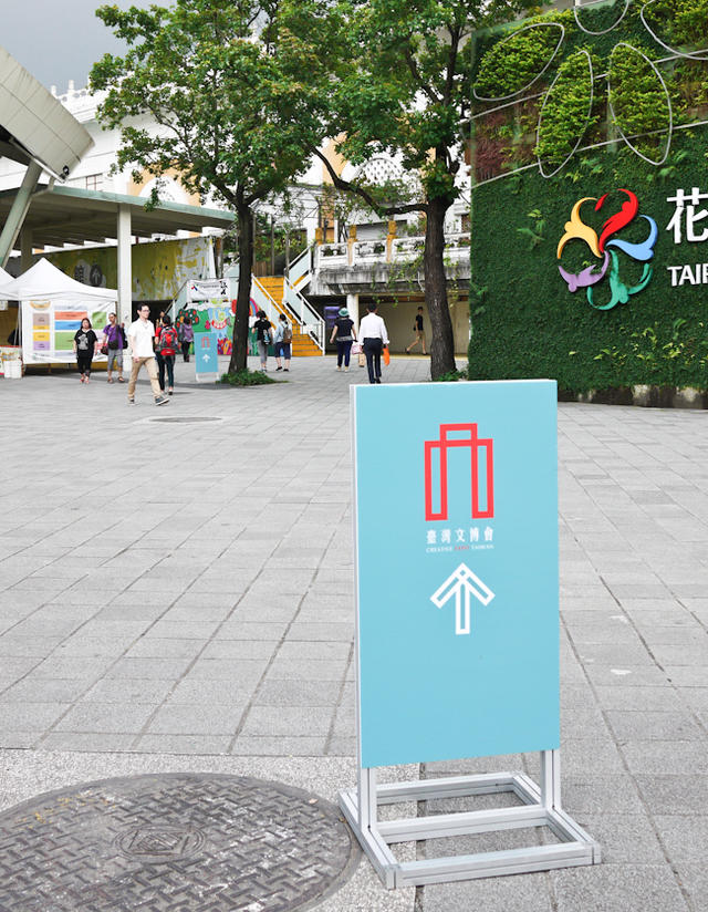 沿途跟著這塊藍綠色指示牌,就能看到許多有「臺灣文博會」字樣的柱子,就是這次在爭艷館的展區。