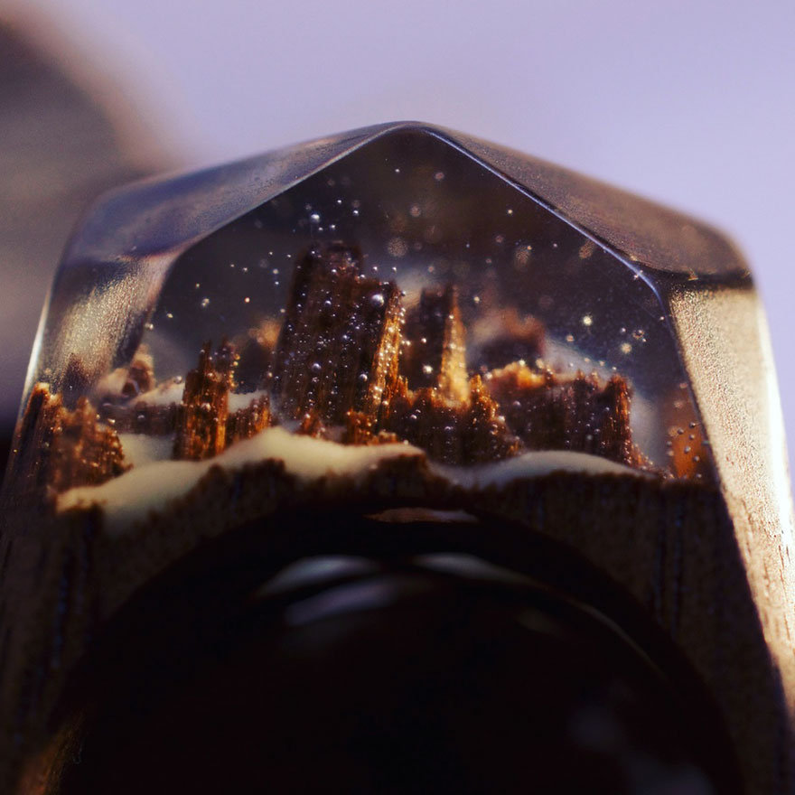 拜 DIY 手作市場的成熟,只要有心想做,材料絕對不是問題,以木頭、珠寶級環氧樹脂和蜂蠟為基底材料,再根據不同主題搭配其他配件,調和色粉營造氣氛,就成了一個個不輸給電影場景的美麗魔域,目光更是捨不得離開它。