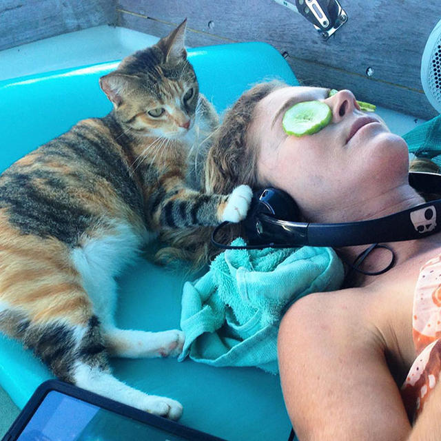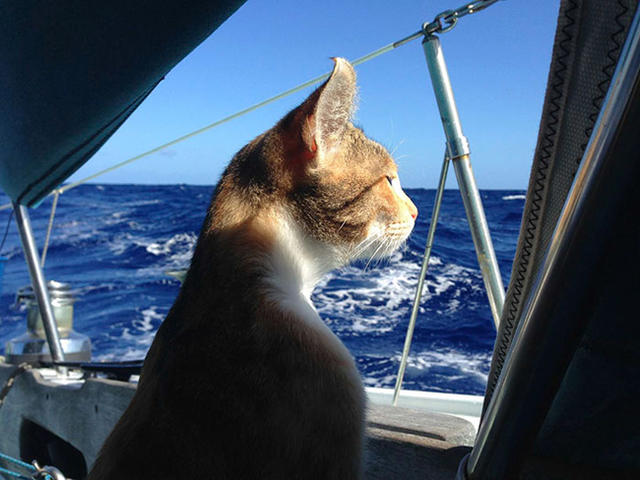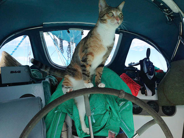 Liz Clark,34 歲,自稱「海盜女王」,從 2006 年辭掉美國加州聖地牙哥的酒保工作後,就開啟她的航行世界海上之旅。Clark 乘著 Cal 40 帆船,實踐她的環遊世界冒險,而在 2013 年,「Lizzy 船長」迎來了 6 個月大的小貓,有趣的是,這位毛同伴是在船上救到的喔!