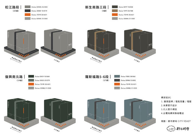 5 月開始,五條改造路段變電箱將陸續換上新色,並重新整理排版箱體上的字體與符號,將人行道與車道訊息分開,以利減少視覺負擔與雜亂的資訊;至於變電箱下方原本佈滿橘黑警示條文的水泥基座,也藉由此次改造重新調整警示條紋的比例,利用行車面及行人面重點局部的呈現,更能達到警示的效益;每座變電箱除了箱體的主色調外,也在內側刷上「輔助色」,讓變電箱整體看起來更有層次感,除此之外,變電箱體上還加入了「色彩推廣」的思維,走在街道上就可以參與色彩認知。