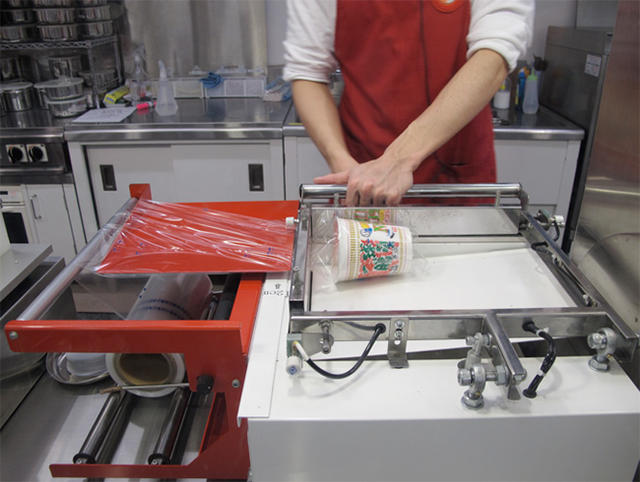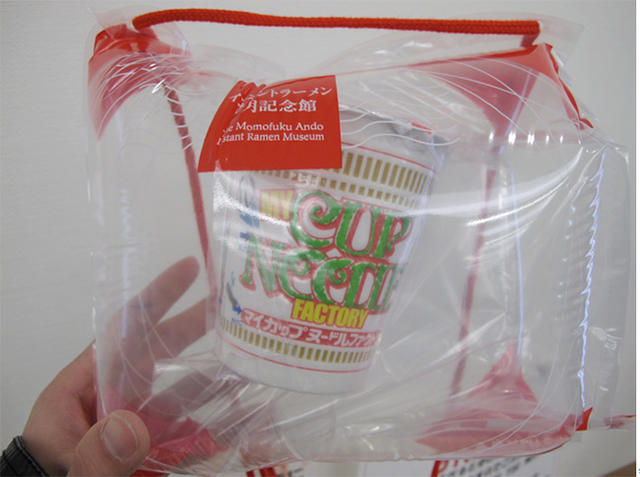 泡麵的內部填滿之後,需再經過對膜、熱封,接著再拿著專屬於你的杯麵放入貼心的防撞套,打氣之後就完成囉!(如果你跟我一樣捨不得在旅程中吃打算帶回台灣,防撞套可以先別打氣,折一折方便行李箱收納)