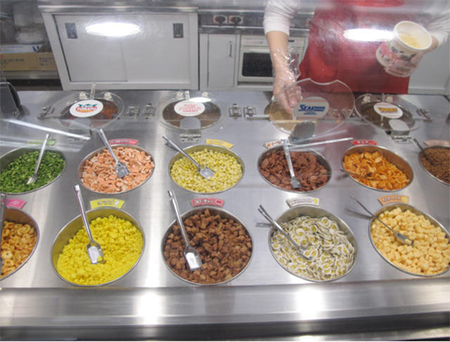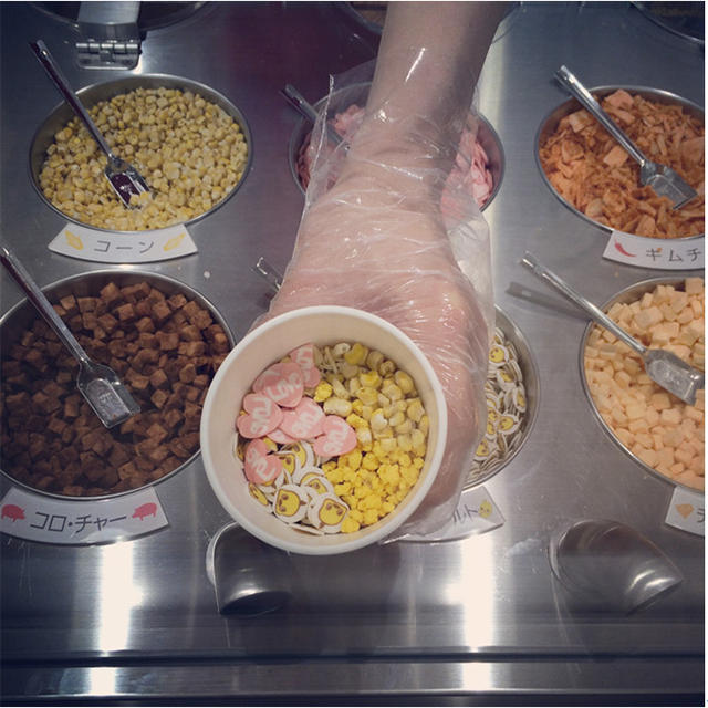 畫完之後,拿著自己的杯子跟著人龍排隊來裝麵、挑配料吧!