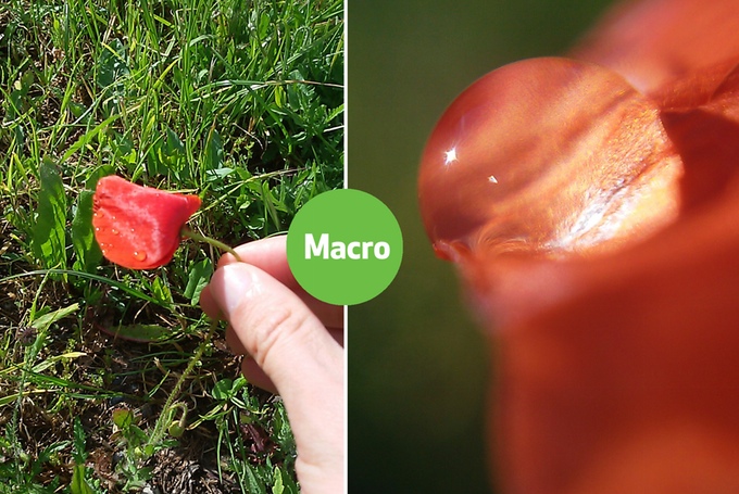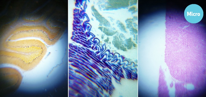 綠色的 macro 適合拍攝距離大約是 1.2 公分,藍色的 micro 可以觀察更細微的影像,效果直逼顯微鏡,能觀察到約莫 1/300mm 的物體,拍攝距離更是直逼貼臉的 6mm(超近!),配上如果心臟夠大顆,想要觀察昆蟲也不成問題。