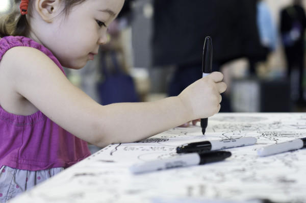 來到紐約設計週的嘉賓,都能享有一個權利:使用麥克筆在潔白無瑕的「畫布」上作畫,而且是永久性的繪畫圖案,把每一件家具擺設都點綴成獨一無二的作品(只能畫這一系列的家具喔)。從塗鴉到較為精細的草圖,桌子、凳子及吊燈都有了獨具風味的「刺青」;順帶一提,這些家具是用鬱金香木製成的呦~