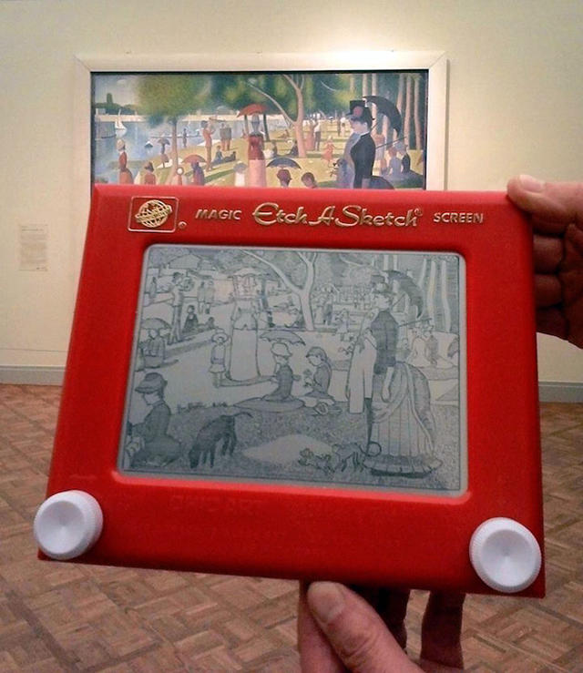 其實一開始,Labowitch 打算在螢光幕前看網路上的名畫圖片,用 Etch A Sketch 「再創作」經典畫作,但最終仍舊決定親自走一趟藝術現場,近距離感受畫作的呼吸與脈搏。事實證明,她滿載而歸:「我在旅途中,認識了來自世界各地,願意分享他們孩提時代,關於 Etch A Sketch 創作故事的人們。」