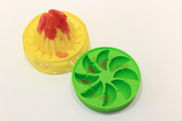 這款製冰盒設計最棒的地方,就是它榨汁錐的孔洞,可以有效導流至其下的製冰盒,製冰盒的空間也彼此連接,可以做出一顆顆獨立完整的果汁冰塊。