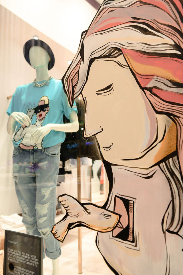 今年春夏特別邀請了著名街道藝術創作者(Street Artist)CANDY BIRD 合作櫥窗,將主題命名為「Different Me」,故事講述著女性有許多不同的面向,利用三個不同空間位置的櫥窗展現不同階段的女性樣貌;隨著藝術家的筆觸,瞇著眼睛帶點喜感的角色人物反應著 CANDY BIRD 內心層面所察覺的社會面貌,首度與女裝時尚相結合,將幽默並帶嘲諷的創作風格轉化為柔和富情感的闡述手法。