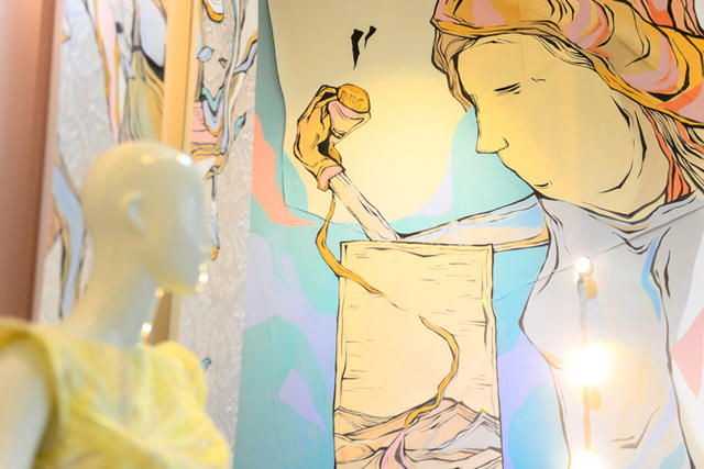 CANDY BIRD 以五幅巨型的油畫布展現女生的不同面向和內心風景,有剛有柔,並分別表現在左右兩個櫥窗中,搭配 Level 6ix 今年春夏的色彩,藝術家首次在作品中以輕快的粉色調作為基底,並以霧灰色取代黑色墨線,國畫般的線條在粉色調中凸顯了女性不平凡的溫柔。