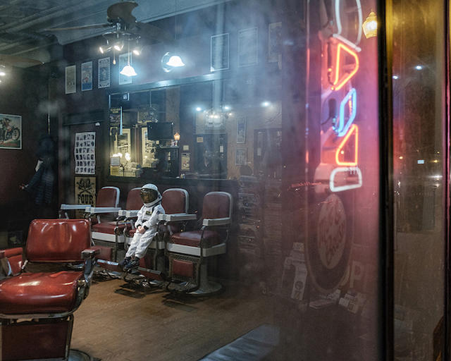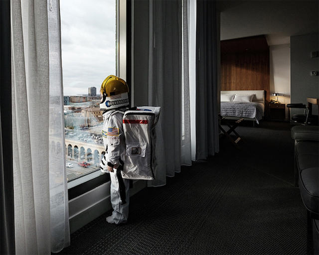 攝影師 Aaron Sheldon 在身穿太空衣的四歲兒子協助下,完成了這一系列充滿好奇心的日常星際之旅,並取名為「Small Steps Are Giant Leaps 我的一小步,是大人的一大步」。透過他兒子的來回徘徊與不斷穿梭,日常空間變得新奇與「外星化」,在孩子的面前,大人的世界宛如另一個星球。