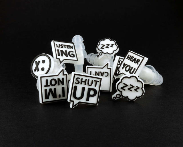 他的耳塞目前都是以黑白配為主,用文字或圖案「大聲」地表達:「我沒有在聽!」「我聽不到!」甚至超直白的「閉嘴!」讓你在出國旅行搭飛機時,除了能避免鄰座乘客的騷擾,還能減輕因起飛或降落造成的耳朵不適。在咖啡廳閱讀、晚上睡覺,以及上班忙碌中,也都能使用它們,來幫助你更進入狀況。