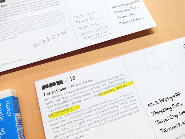 最後也是最重要的一點,就是希望藉此,重新鏈結人與人間的關係。「現在社會案件很多,我認為核心原因都是『不知道如何溝通』。虛擬世界與真實世界的相處與溫度是截然不同的。」基於此因,PPW 的明信片,有著異於一般尺寸的特殊設計。它有獨特的兩聯式地址欄,你讀完後,可以將舊欄位撕掉後再轉寄給別人。「我們發現一個很有趣的現象,試讀讀者們收到後在臉書上發文,他們的朋友們都會留言希望轉寄給他。」這樣的人際互動,就是這個計畫最希望推動的行為改變。