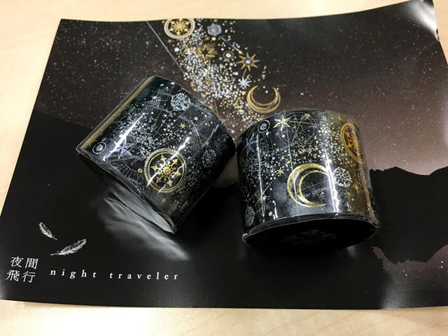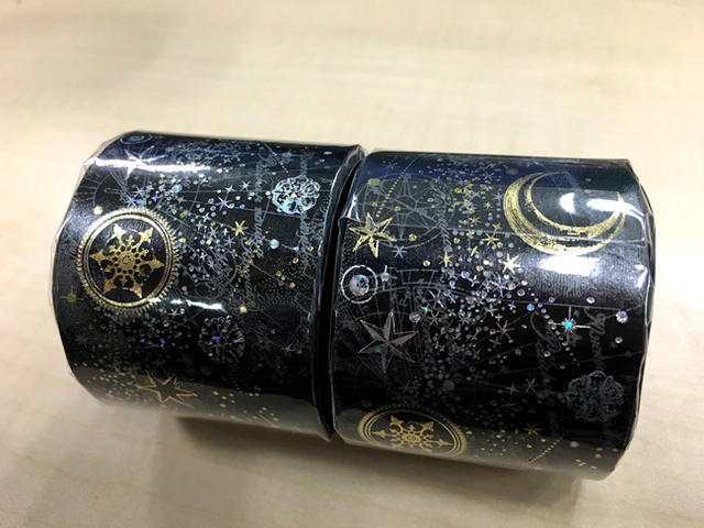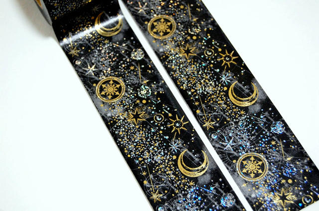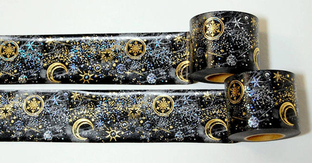 紙膠帶本身使用銀色與黑色印刷,在上面用全像防偽(Holography Foil)銀箔燙金來表現星空閃耀之美,星星、月亮齒輪等圖案則是以金箔燙金。