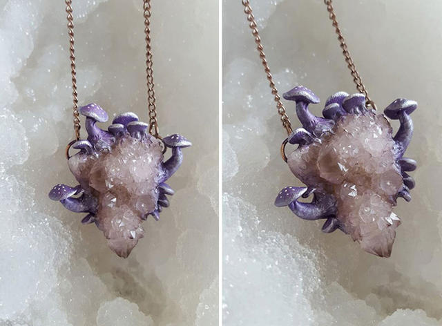 現居美國佛羅里達州的藝術家 Cheryl Lee,創作了一系列仿造自然的美麗配件,樹木與蕈類在礦石中蔓延出綠意,昆蟲與動物用綺麗的外衣,讚嘆了大自然的奧秘;將它們小心翼翼地穿戴在身上,瞬間魔法降臨,彷彿化身為飛舞翩翩的精靈或是守護森林的矮人。